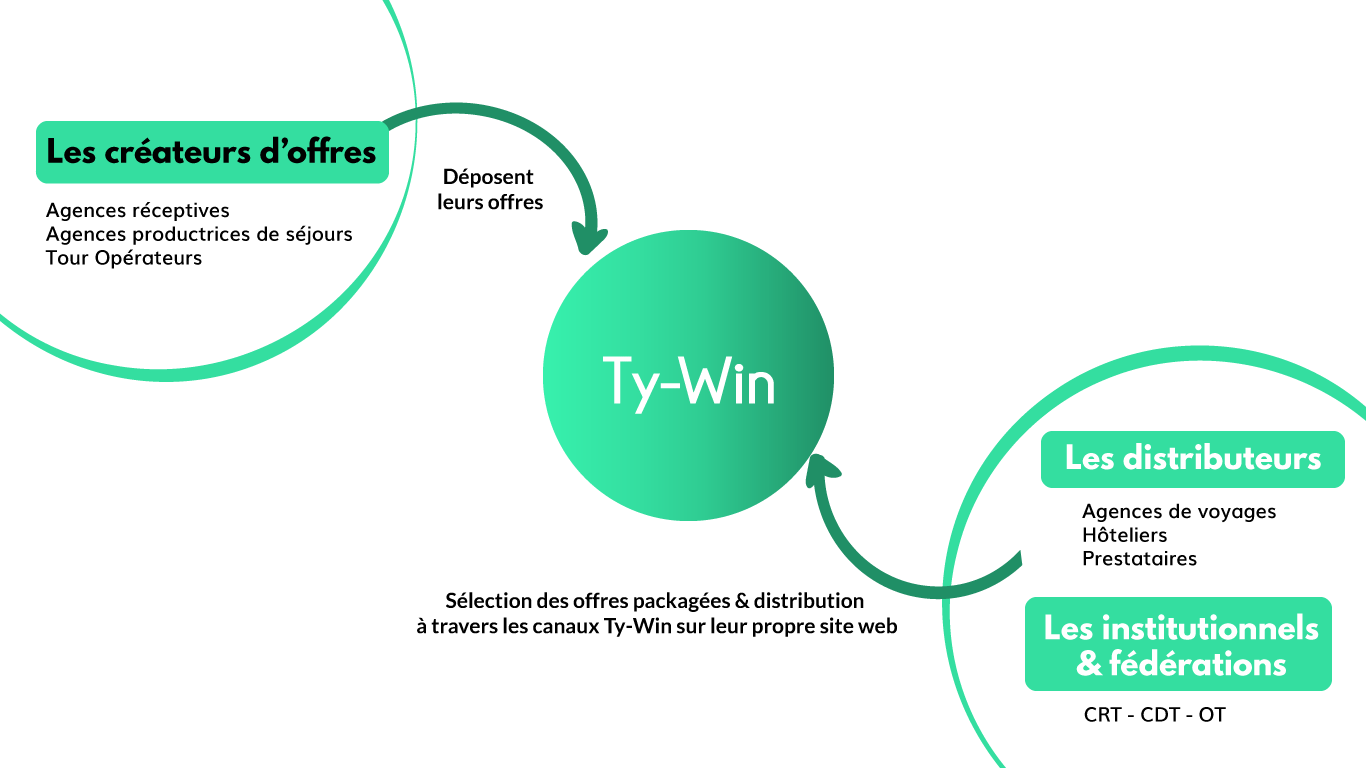 Les créateurs d’offres (agences réceptives et TO), déposent leurs séjours packagés sur la plateforme Ty-Win dans lequel les distributeurs (agences de voyages, hôteliers et prestataires) viennent sélectionner les offres adaptées à leurs clientèles.